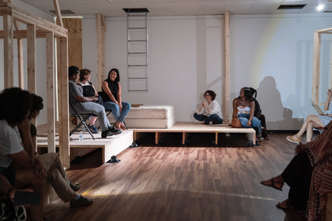 Samuelson’s work, Telegraph Valley assembles house frames, ladders, floating decks, mattresses, rotating light sources, and one dancer to make momentary dwellings out of holes and passageways. The work looks for the ways we find home in bodies that experience more loss as they accumulate more life. It attempts to deconstruct the body as a “house for the soul” metaphor to uncover something that roves, collides, undercuts, and transforms what we understand ourselves to be, how we merge with others, and merge with our own solitude, to get somewhere new.